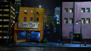 City set built of cardboard and stuff pulled out of the recycling bin. Animation is hand drawn frame-by-frame.